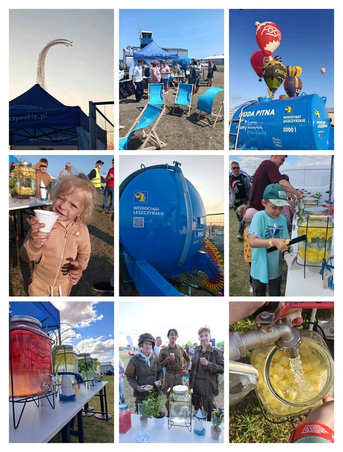 Było cudownie i odlotowo. Nasze stoisko było do dyspozycji uczestników przez całe dwa dni pokazów. Ilość wody, którą poczęstowaliśmy ludzi to ponad 1,5 tysiąca litrów w wietrzny piątek oraz ponad 10 tysięcy litrów w upalną sobotę! To dla nas rekordowa ilość i jednocześnie ogromna satysfakcja z udanej akcji w ramach prowadzonej kampanii Pijemy leszczyńską kranówkę. Nasze nowe beczki z wodą zdecydowanie zdały egzamin. Nasza wesoła ekipa również. Dużym zainteresowaniem, szczególnie najmłodszych, cieszyła się także instalacja edukacyjna.