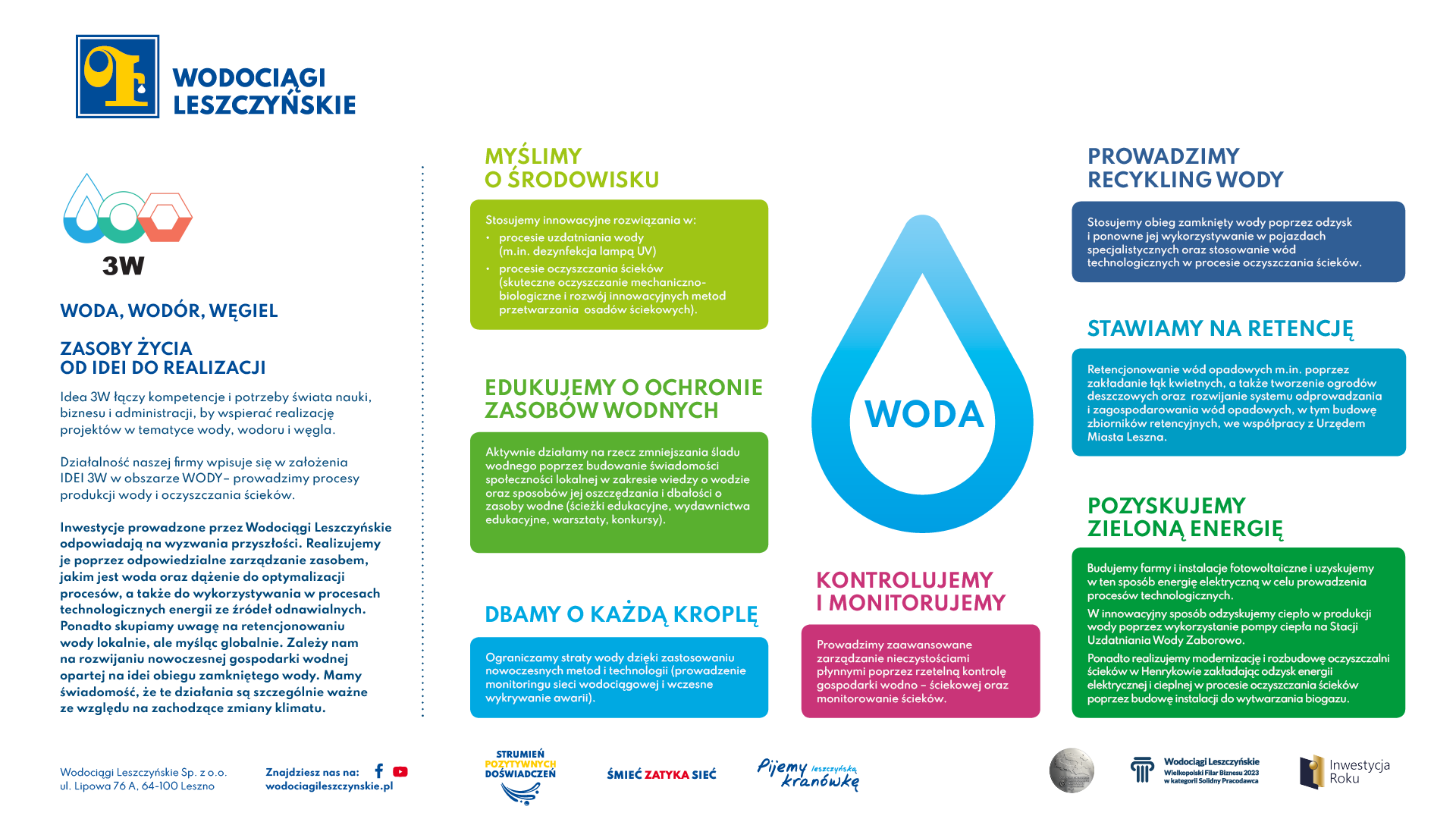 Idea 3W to projekt Banku Gospodarstwa Krajowego. Inicjatywa koncentruje się na 3 kluczowych zasobach będących fundamentem życia na ziemi: wodzie, wodorze i węglu (3W). Celem Idei 3W jest wspieranie świata nauki, biznesu i administracji w rozwoju nowoczesnych technologii stosowanych w przemyśle, energetyce i medycynie, a także budowanie i integrowanie społeczności utalentowanych naukowców, ambitnych studentów, odważnych przedsiębiorców, wizjonerskich organizacji pozarządowych i odpowiedzialnych przedstawicieli sektora publicznego, instytucji finansowych oraz aktywizowanie społeczeństwa. Nowoprzyjęte do świata 3W podmioty, w tym Wodociągi Leszczyńskie, chcą współpracować z Bankiem Gospodarstwa Krajowego nie tylko w obszarach związanych z trzema zasobami, ale i tematach, które koncentrują się wokół odnawialnych źródeł energii i zrównoważonego rozwoju. Dowiedz się więcej na temat inicjatywy 3W - TUTAJ |