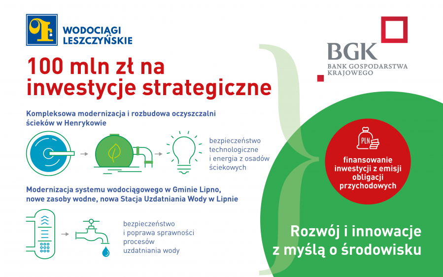 Bank Gospodarstwa Krajowego przeprowadzi emisję obligacji przychodowych do 100 mln zł dla Miejskiego Przedsiębiorstwa Wodociągów i Kanalizacji Spółka z o.o. w Lesznie. Dzięki pozyskanym środkom MPWiK zrealizuje inwestycje strategiczne, w tym zmodernizuje i rozbuduje oczyszczalnię ścieków w Henrykowie oraz przeprowadzi modernizację systemu wodociągowego w Gminie Lipno. Inwestycje te zapewnią na kolejne kilkadziesiąt lat bezpieczeństwo odbioru ścieków i dostaw wody oraz wyraźnie ograniczą bieżące koszty eksploatacyjne, znacznie poprawiając między innymi efektywność energetyczną.