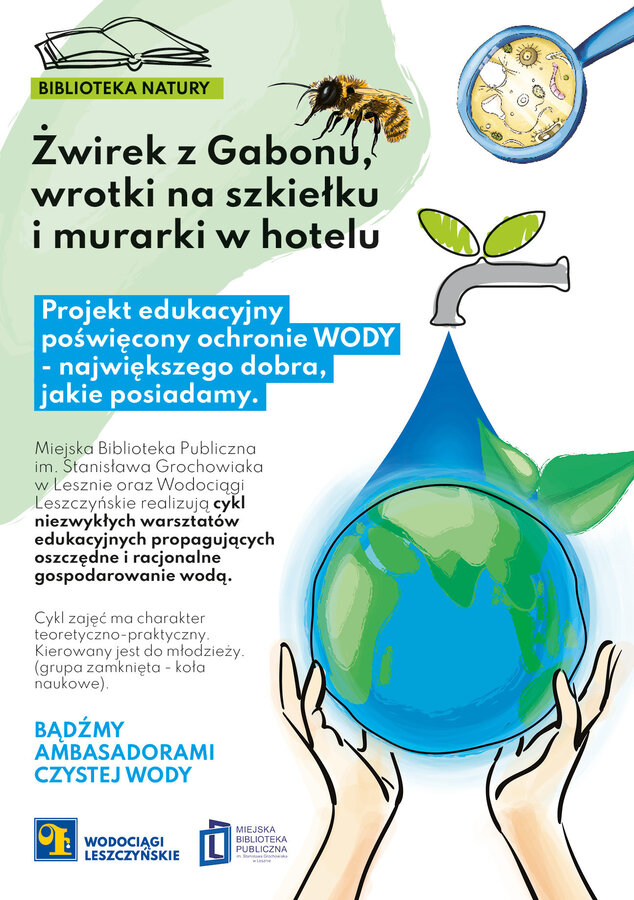 Za nami pierwsze spotkanie z cyklu pod intrygującą nazwą "Żwirek z Gabonu, wrotki na szkiełku i murarki w hotelu", który Wodociągi Leszczyńskie realizują wspólnie z Miejska Biblioteka Publiczna im. Stanisława Grochowiaka w Lesznie, w ramach projektu pn. "Biblioteka natury" w obszarze tematyki dot. wody.