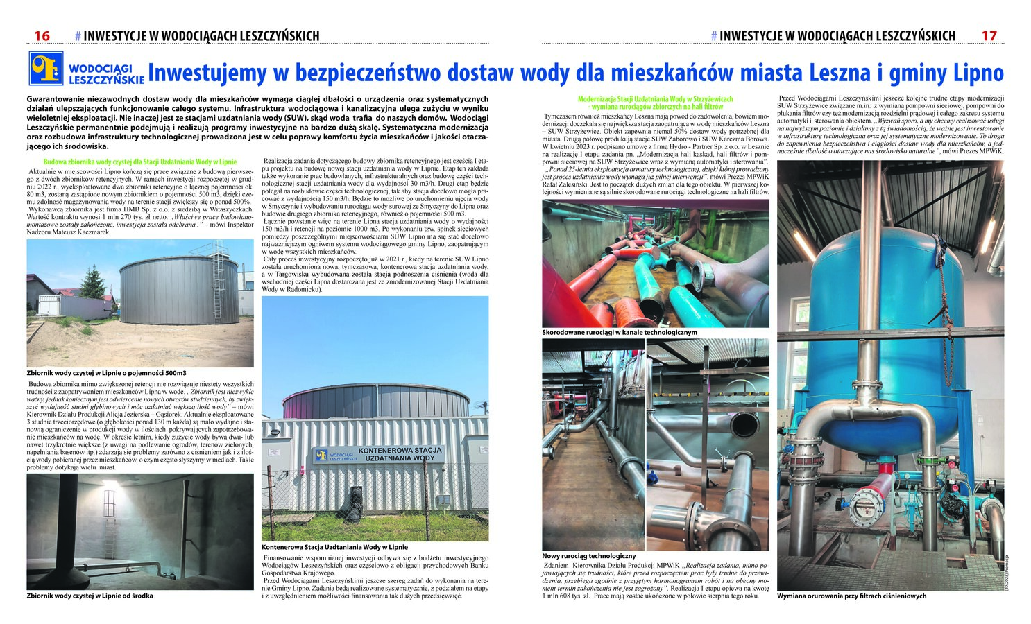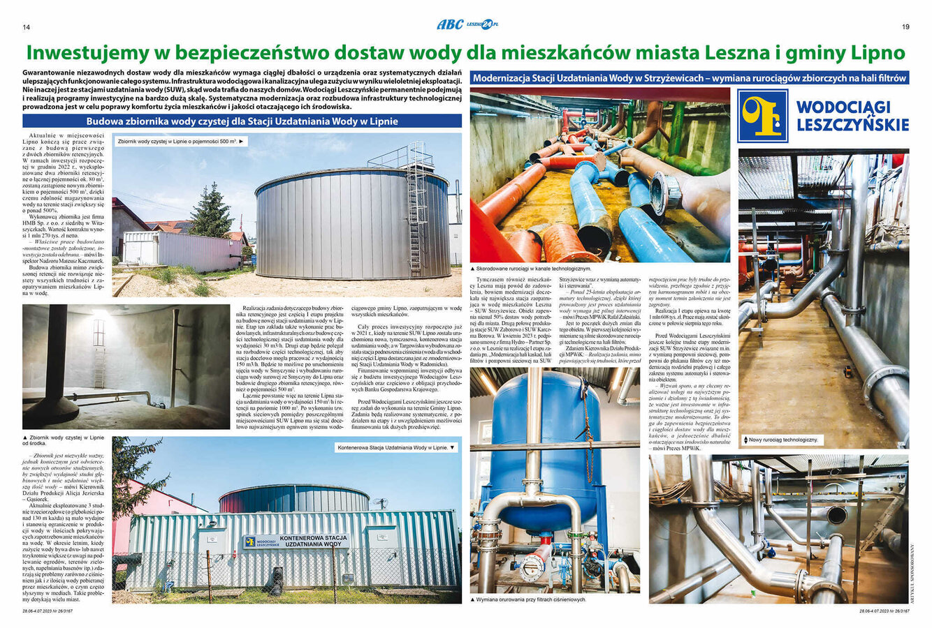 W najnowszym numerze Gazety ABC oraz na łamach Leszczyniaka polecamy artykuł o naszych wodociągowych inwestycjach w Lipnie i na Stacji Uzdatniania Wody w Strzyżewicach (czerwiec 2023).